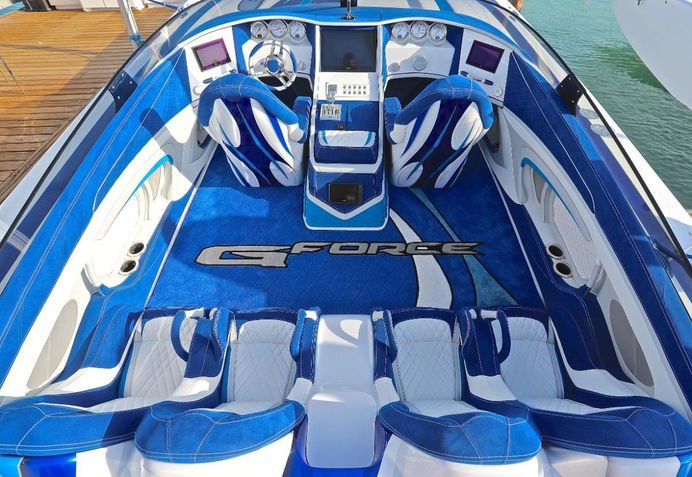 All of the ravings on our 388 instilled a desire to build a new 388 on steroids. Size wise, the 438 is a 10% enlargement of the 388. 10% deeper tunnel, 10% longer running surface, 10% wider sponson, 10% wider tunnel, etc., etc., etc. However for many years now, we had been thinking of a radical bottom design change that would give the boat outstanding rough water capabilities along with an improved top end performance along with tremendous range and load carrying capacity. It is well-known that a fully loaded cat or V suffers a performance loss under these conditions, one reason why our competitors offer fuel capacities that are a third to a half of what Skater offers. Well, the bar has been set higher once again. The 438 will run at very high speeds with 1350 Mercruiser engines and fully loaded with both passengers and 600 gallons of fuel. Now, that’s impressive! A long running surface and a 12’+ beam allow this boat and others above 38’ to accommodate our ultra-wide cockpit with comfortable seating for 8-9 adults.