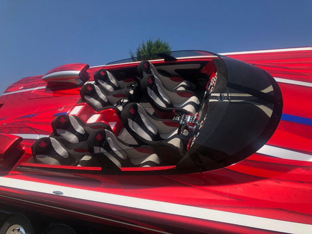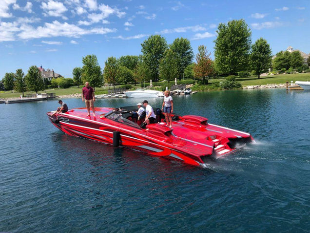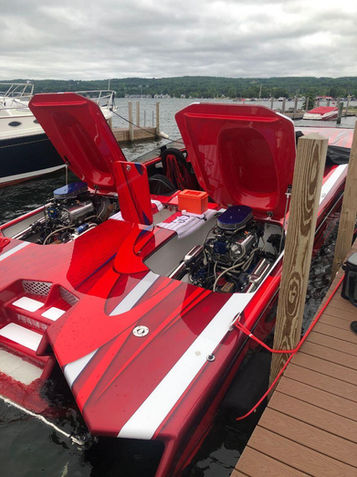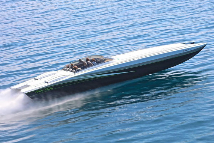 For now, the biggest boat of the Skater fleet and one of the most enduring and versatile boat in the Skater lineup. Originally built to supersede the 40 Classic for racing, it immediately became a success on the APBA Offshore circuit, winning its inaugural Key West Offshore Championship. Even a boat as large as the 46 found its way into the niche of top Cat in the Open and Superboat class. The evolution of the 46’s lamination schedule and sponson configuration was and still is a changing one. Imagine building a hull for 750hp Mercruisers with #6 drives to the same hull with a pair of 1650’s with #8 drives or, for that matter, turbines with surface drives or even a hull with 4 engines and 4 drives. The answer, of course, is that each hull is tailored to its engine/drive configuration through the use of variable sponson rake and tunnel width. But its only a little more work- right? Another variable in ALL Skaters is the amount of fuel any boat can carry. A successful tank design approved by the USCG allows us to build the tank as a structural member of the boat as well as damping device for rough water. Tanks of any reasonable size can therefore be built into any Skater.